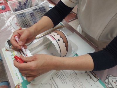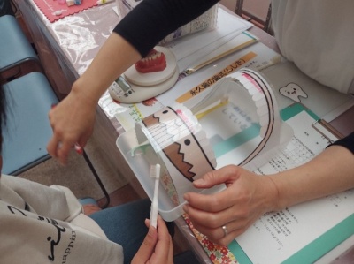 説明、顎模型や、紙で製作したお口の絵に DH がペンでマーキングし、お子さんにブラシを当ててもらい、ブラッシングの角度や、持ち方、磨く場所のポイントなどを実際にイメージしてもらった。(現在、インフルエンザが流行中の為、口腔内での染めだしや、口腔内の接触はなしとした)また、お口ポカンについての質問や、口呼吸から鼻呼吸にする必要性の説明なども行った。